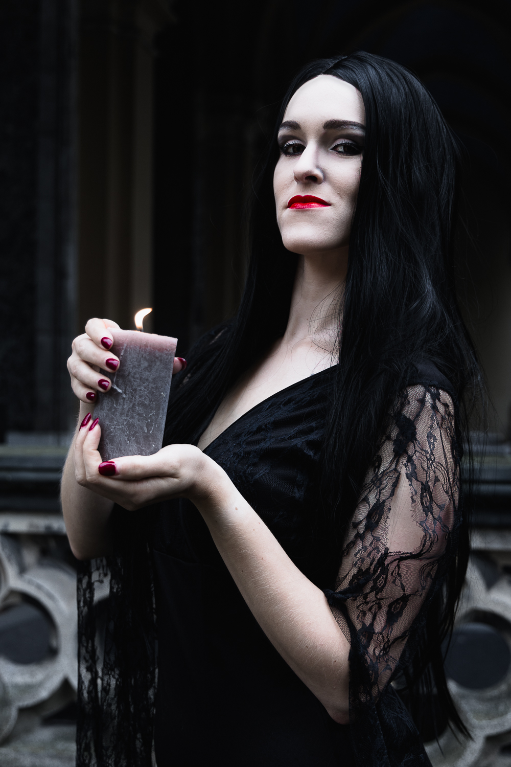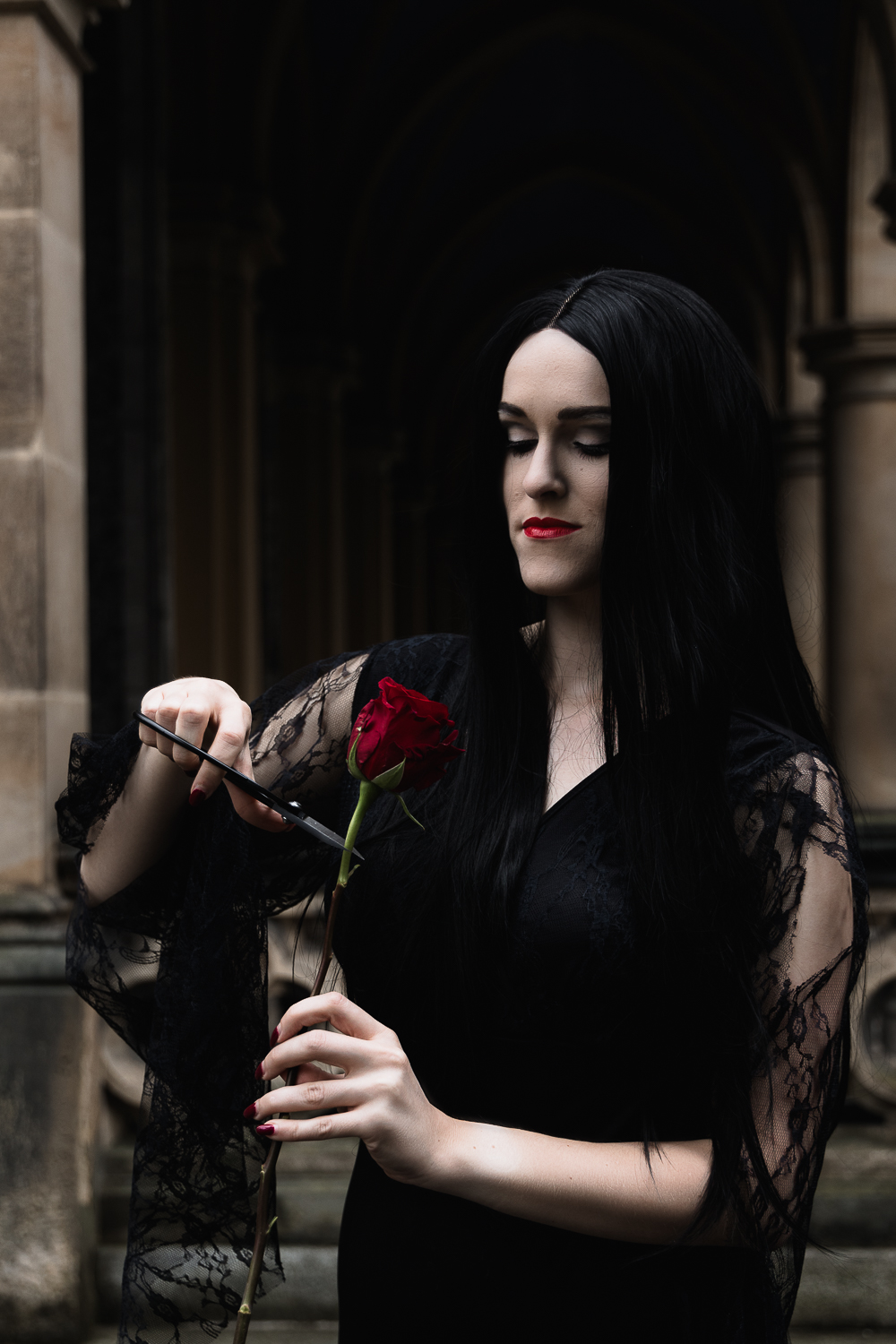 S Pavlínou jsme nafotily její pojetí Morticie Addams u kaple svatého Václava na Vinohradském hřitově v Praze. Ticho, klid a atmosféra, která vás pohltí.